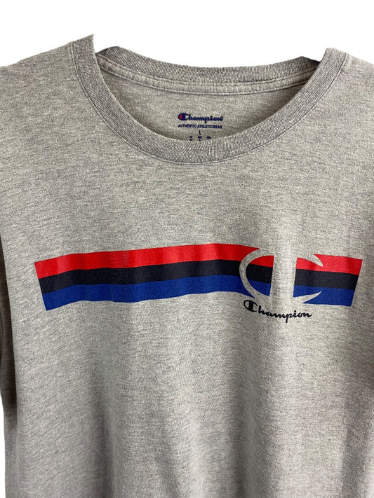 Large Champion Men's Gray Short Sleeve Tshirt Retro Stripe Logo