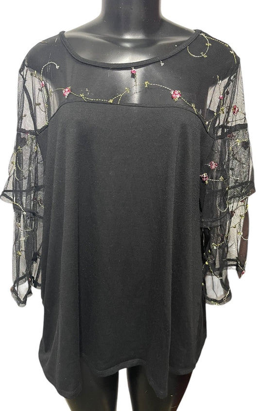 1X Ultra Teeze Womens Black Mesh Yoke Sleeve Embroidered Shirt