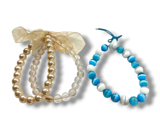 3 Stretch Bracelets Faux Blush Pearl Clear Blush Blue White Beads