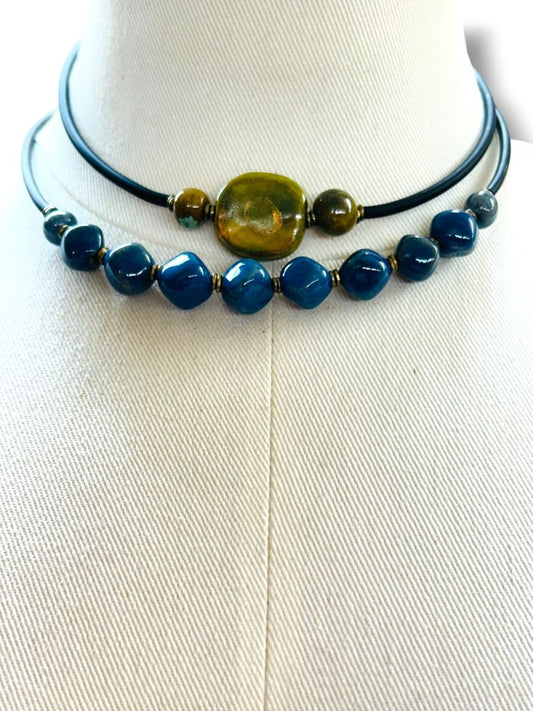 2 Necklaces Wrap Cord Adjustable Choker Blue Green Stone