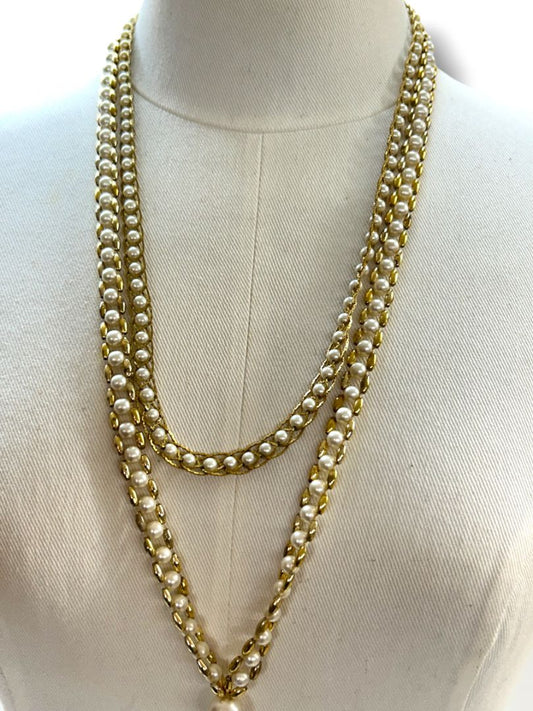 2 Necklaces Goldtone Faux Pearl Vintage Trifari 25" Spring Clasp Unbranded String 36"