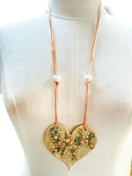2 Vintage Necklaces Clay Heart 3" on Ribbon Mauve Ribbon Green Acrylic Strand String 54"