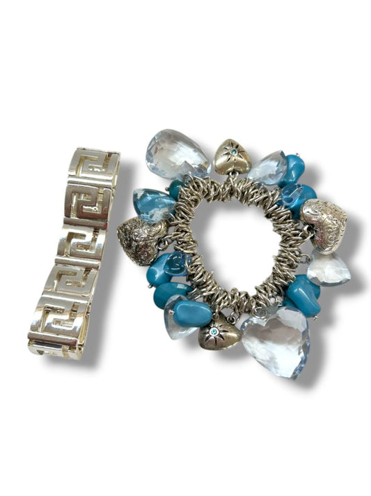 2 Stretch Bracelets Silvertone Blue Heart Charms Chunky