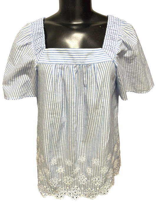 XS Loft Womens Flowy Blouse Shirt Striped Embroidered Blue White