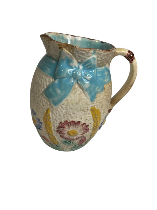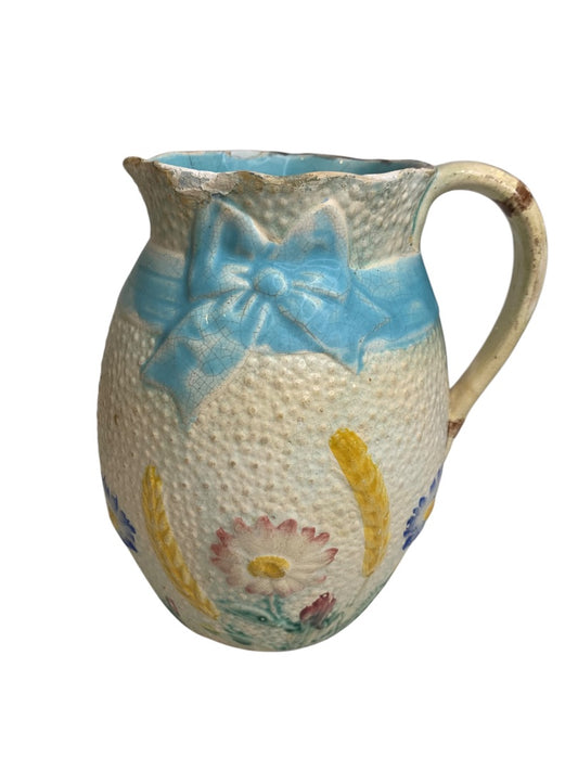 Antique Majolica Pitcher Pottery Wildflower Blue Bow Flower 7.5 Inch