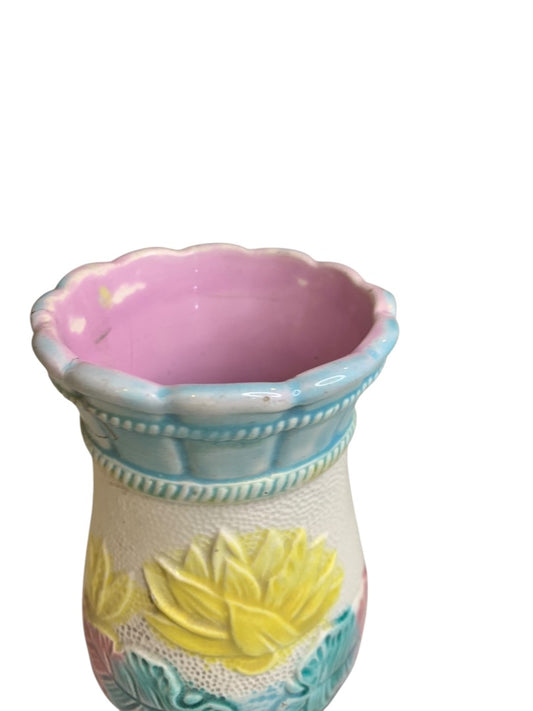 Antique Majolica Water Lily Pond Vase 5.5 Inch High Repaired Vivid