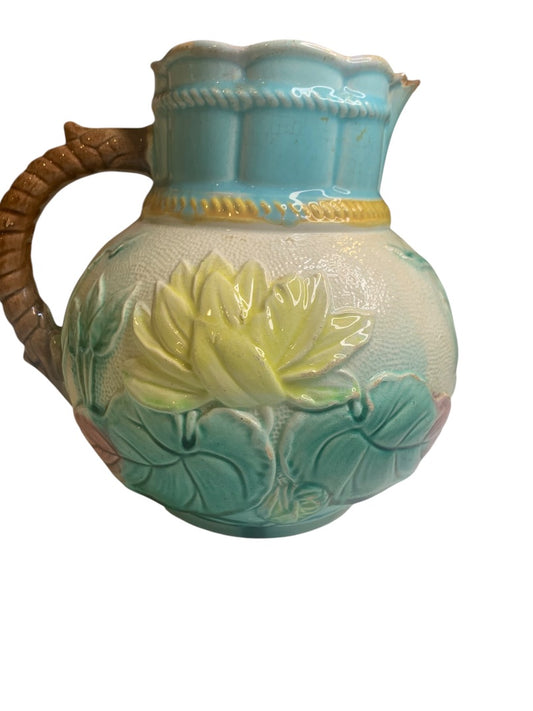 Antique Majolica Lily Pond Pitcher Pottery 5 Inch Vibrant Color