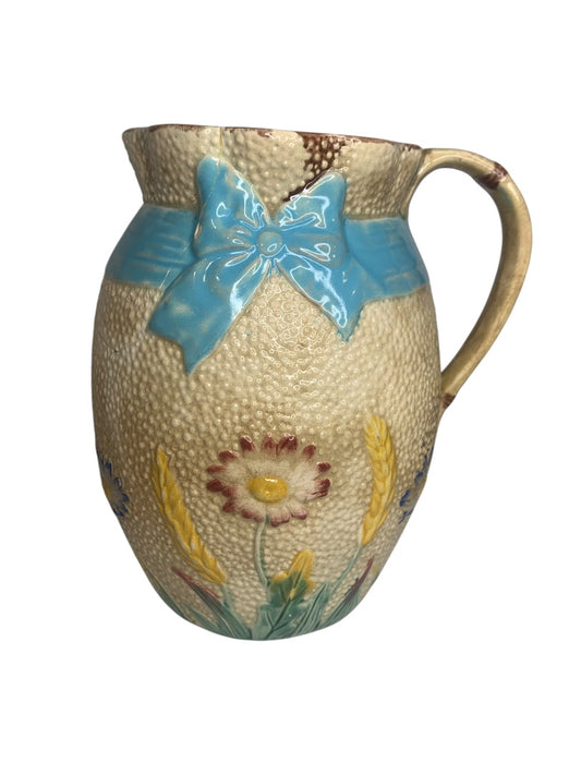 Simon Fielding Majolica Pitcher Ribbon Pattern Antique 8 Inch Wildflower Ribbon
