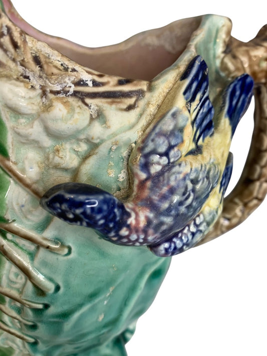 Majolica Pottery Pitcher Antique Bird Corset 1880s 8.5 Inch