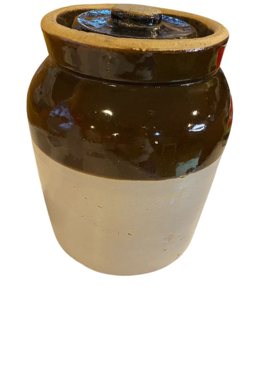 Vintage Stoneware Lidded Crock Two Tone Brown Farmhouse Rustic Decor