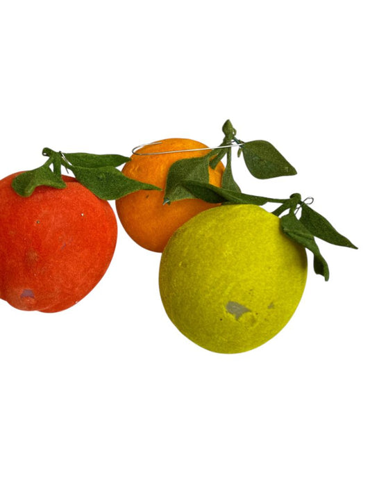 Vintage Flocked Velvet Fruit Set of 3 Ornaments Apples Orange 3 Inch