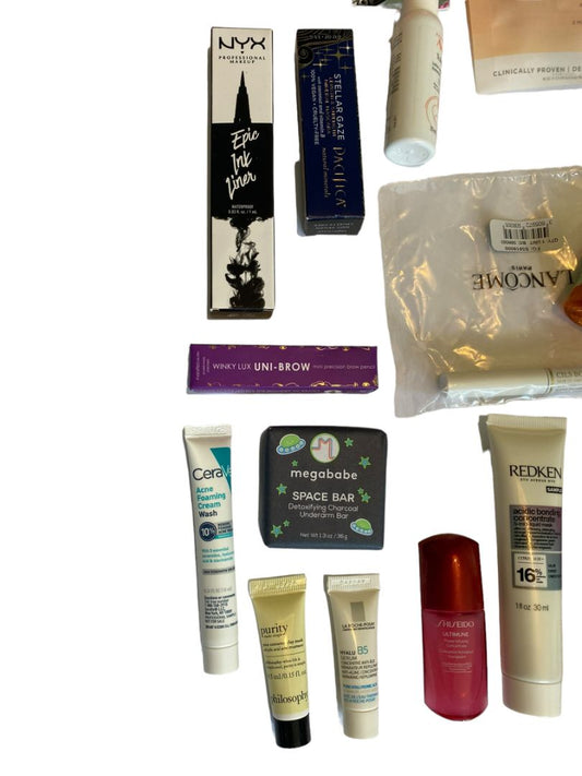 Mixed Lot of Beauty Samples Toiletries 21 pieces Lancome Redken Megababe Purity Shiseido Buxom Pacifica and more plus Neaon Pink Case