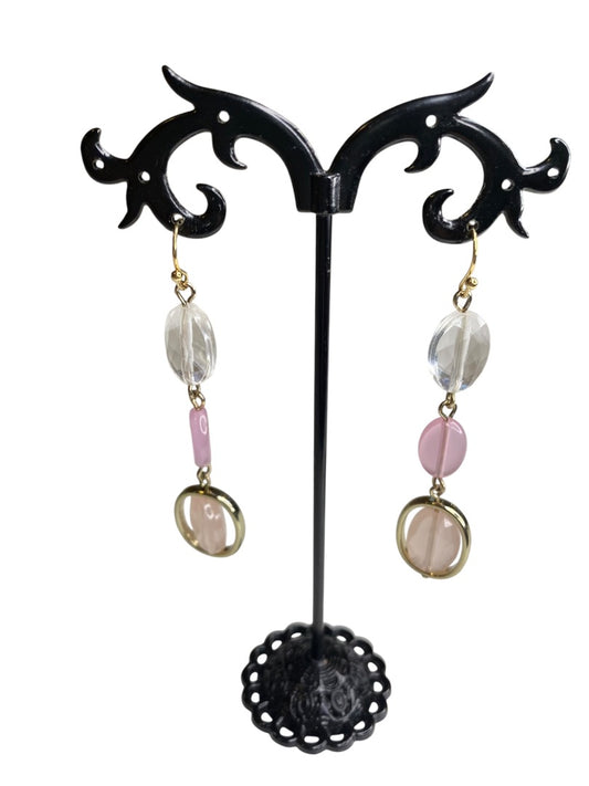 Goldtone Pink Clear Bead Pierced Fishhook Earrings 2.5" Drop