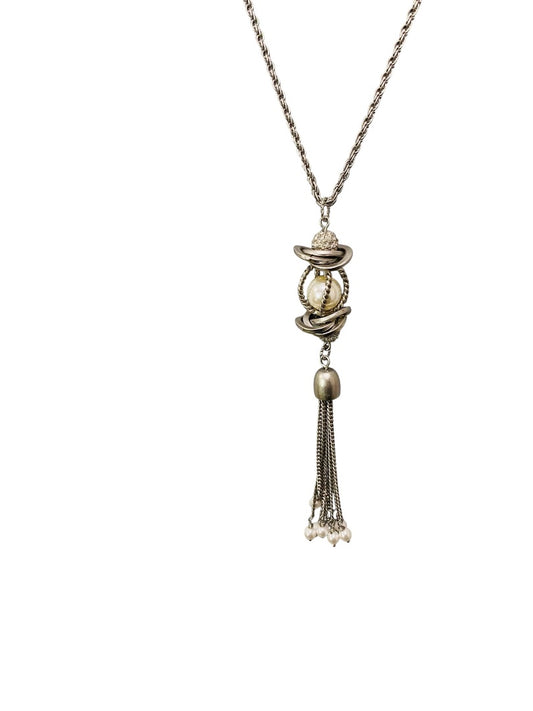Lia Sophia Silvertone 5" Tassel Necklace 30" Lobster Clasp Sparkle Faux Pearl