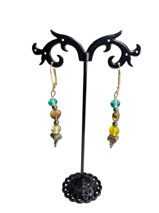 Goldtone Leverback Pierced Earrings 2.25" Beaded Drop Multicolor