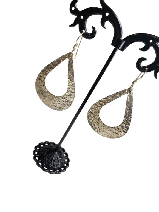 Silvertone Hammered Pierced Fishhook Earrings Lightweight 2" Drop