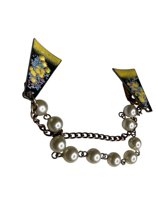 Vintage Enameled Sweater Clip Yellow Chain Abstract 7"