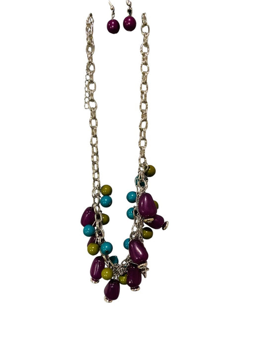 Paparazzi New Silvertone Necklace and Earring Set Purple Teal Chunky 28"
