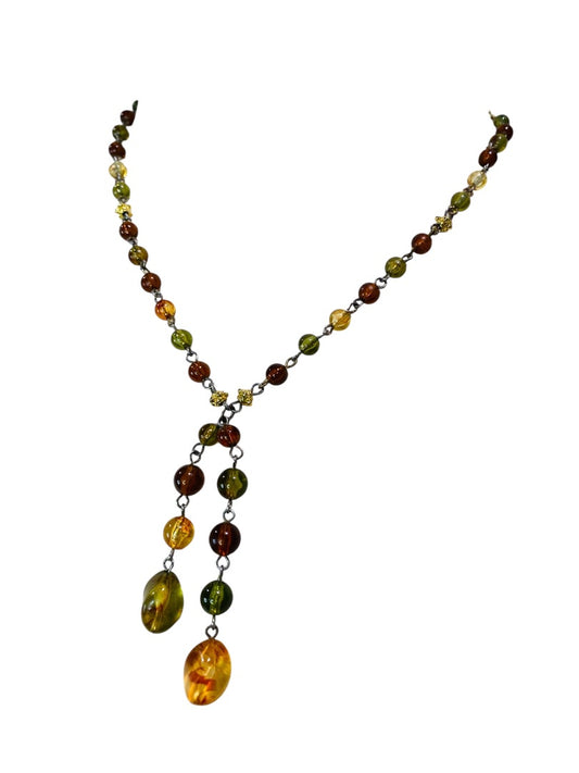 Beaded Silvertone Necklace 20" Amber Green Purple 21" with 2" Drop