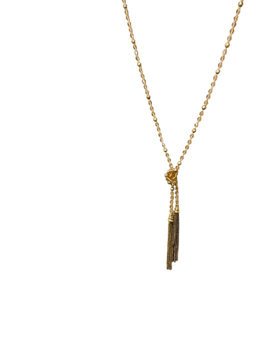 Goldtone and Beige Crystal Knot Necklace Tassel 40" Overhead