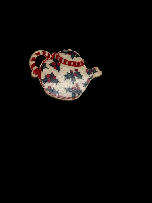 Wooden Teapot Pin Brooch Holiday Holly Christmas 1.75"