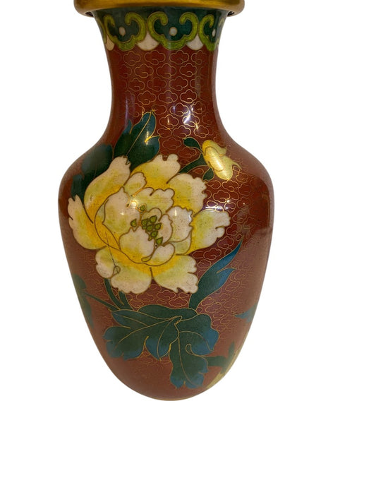 Vintage Oriental Yellow Peonies Enamel Cloisonne Vase 7"