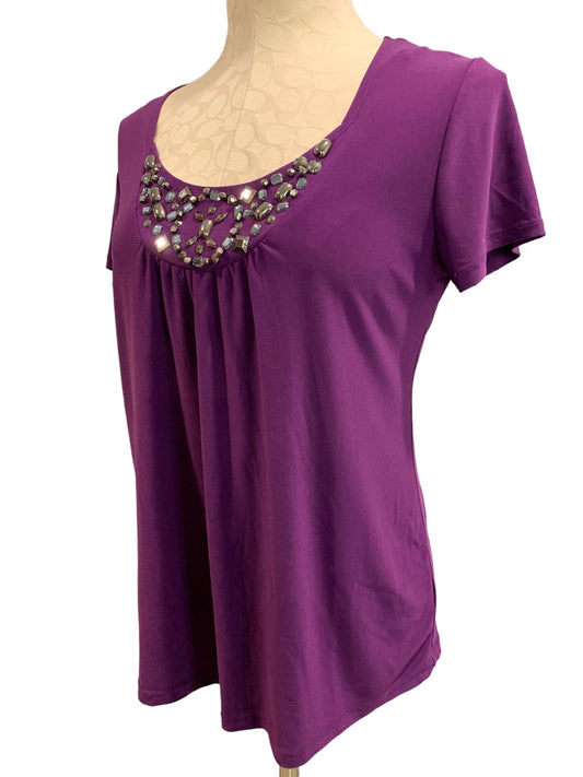 Small Notations Purple Short Sleeve Pullover Shirt Blouse Embellished Neckline
