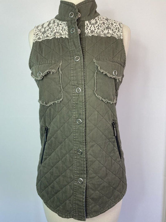 Small BKE Gimmicks Army Green Quilted Vest Lace Accent Boho