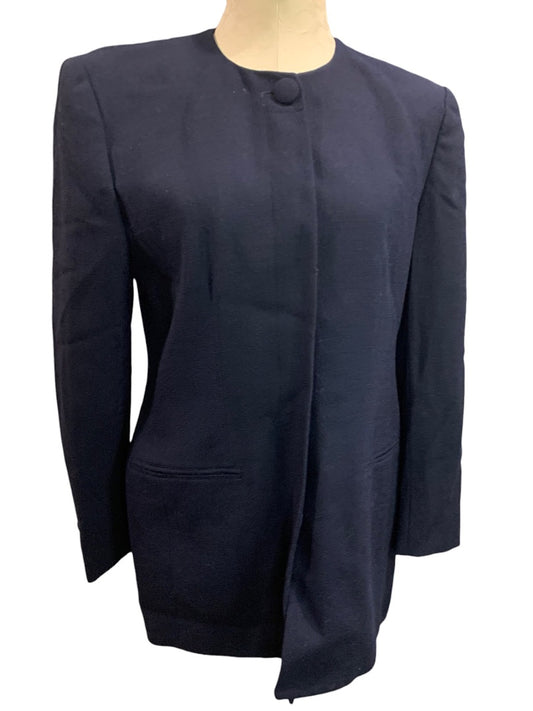 Size 8 Jones New York Women's 1990s Vintage Navy Blue Wool Blazer Below Hip
