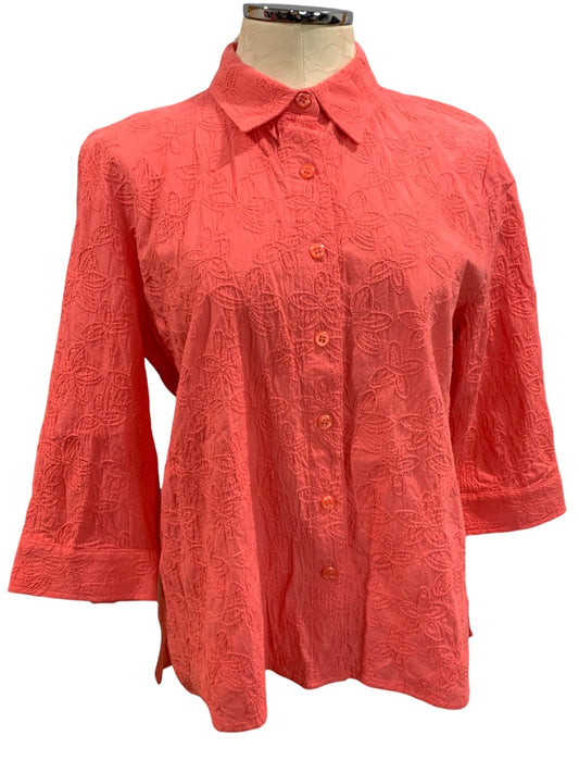 Medium Petite Women's Casual Coral 3/4 Sleeve Embroidered Button Up Blouse