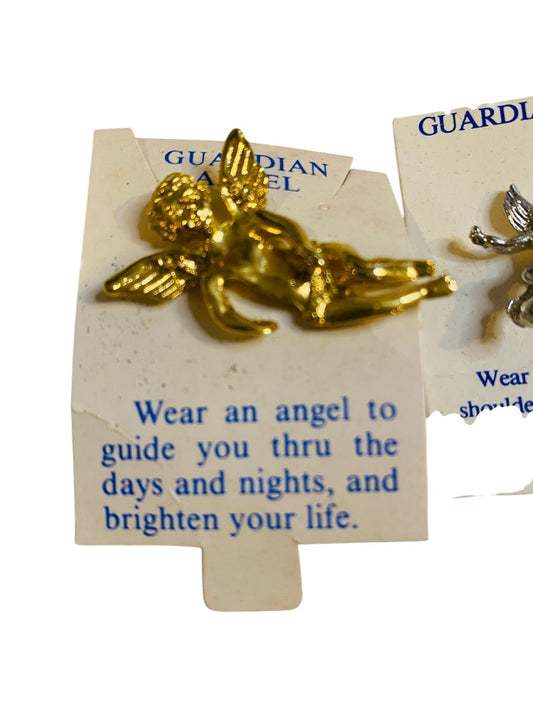 Set of 2 Vintage Guardian Angel Shoulder Pins Goldtone Silvertone on Cards