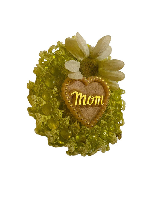Vintage "Mom" Brooch Pin Kitschy Green Daisy Plastic 2.25"