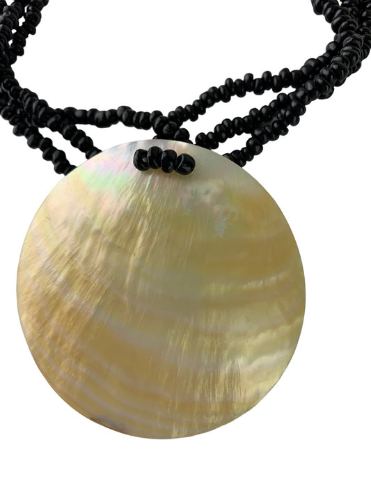 Shell Pendant Statement 16" Necklace Triple Black Beaded Strand Barrel Screw Closure