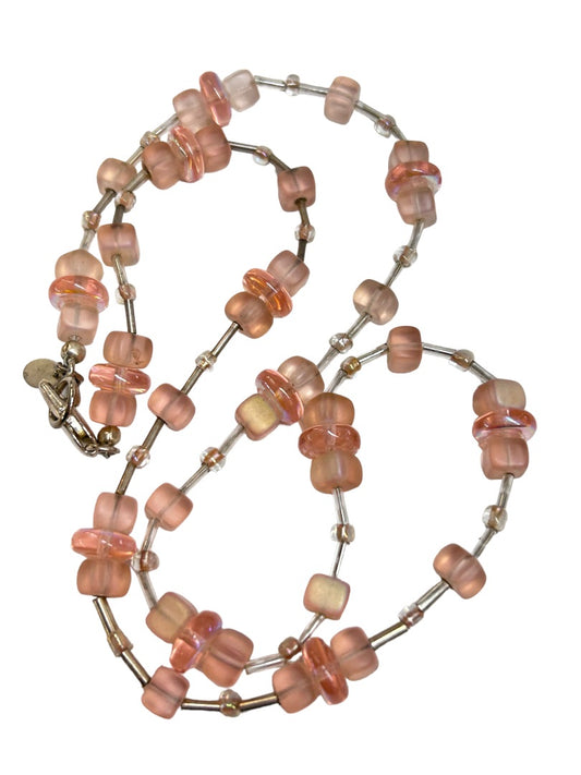 Pink Glass Beaded Necklace 25" with Clasp Silvertone and Clear Accents