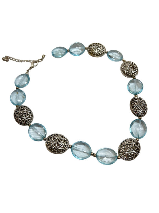 Blue and Silvertone 18" Necklace Faceted Floral Design Lobster Clasp