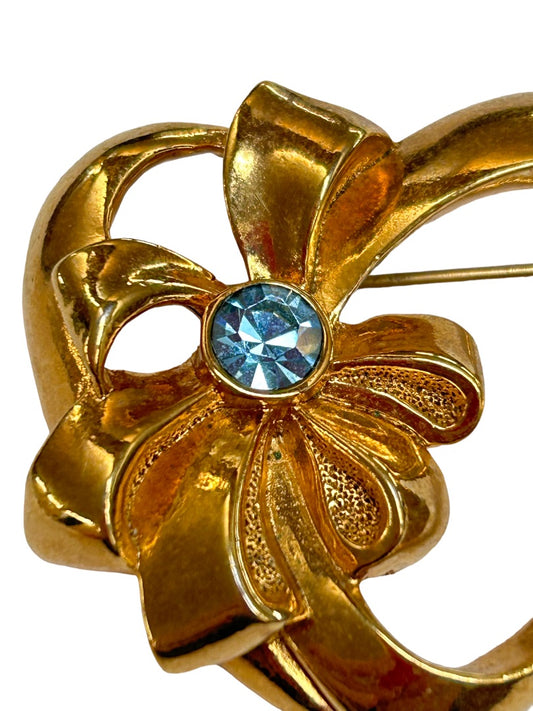 Vintage Signed Avon Brooch Pin Goldtone Heart with Bow Blue Stone 1.5"