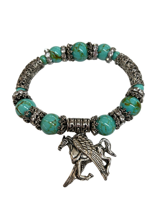 Stretch Bracelet Horse Wings Faux Turquoise and Silvertone Beads