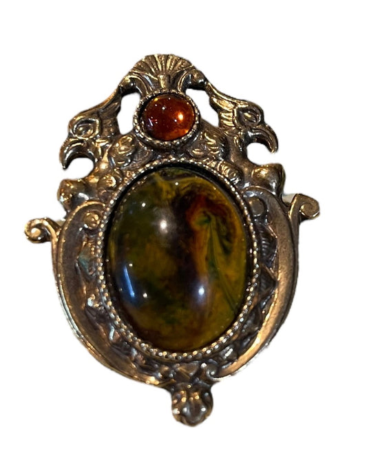 Vintage Baroque Ornate Brooch Pin Goldtone Oval and Round Cabachon Faux Stones 2"