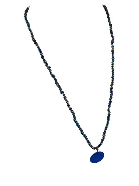 Beaded Necklace Dark Purple Blue Beads Blue Medallion "Sharknadeaux 2018" 27" No Clasp