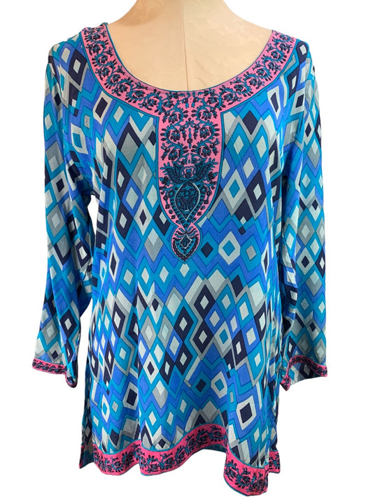 Small Tolani Women's Slightly Sheer Silk Hooded Pullover Tunic Blouse Boho Print