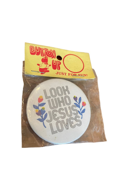Button Up "Look Who Jesus Loves" Pin Back New 2.25" Diameter