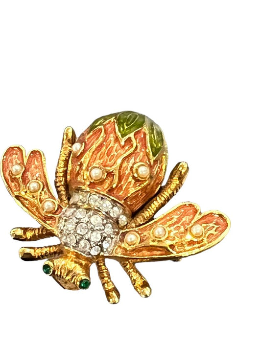Vintage Joan Rivers Lily Of The Valley Bee Brooch Enamel and Faux Pearl Crystal Goldtone