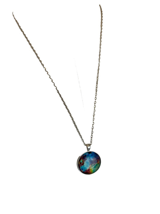 Silvertone Pendant Necklace Galaxy Pattern 24" Chain 1.25" Pendant