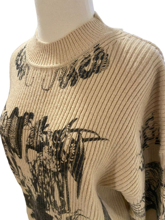 Large Cider Tan Graphic Print Sweater Funnel Neck Ribbed
