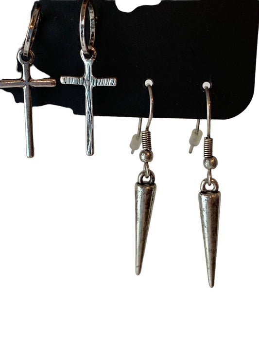 Spencers BodyRage 3 Pack Silvertone Earrings Tassel Cross Spike Pierced New