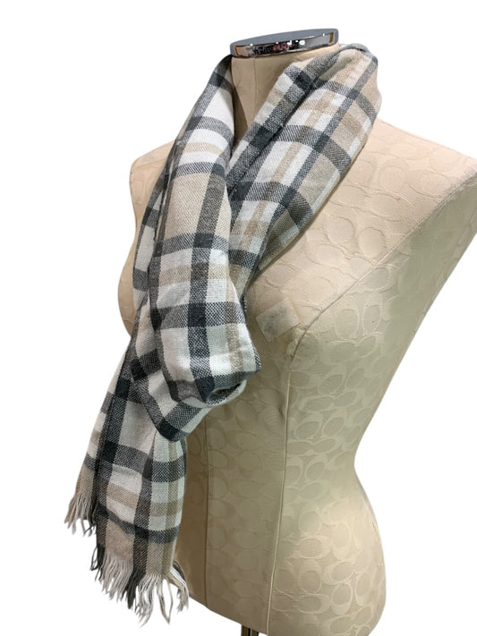Loft Womens Plaid Winter Scarf Soft Gray Tan Fringed 43" x 9.5"