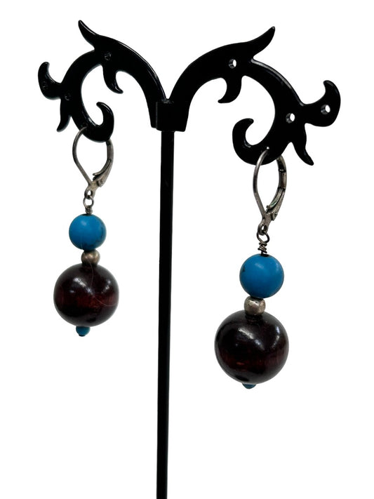 Silvertone Earrings Pierced Leverback Wood and Turquoise Beads 1.75" Drop Dangle