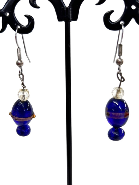 Blue Glass Beaded Earrings Pierced Hook 2" Drop Dangle Silvertone Hook