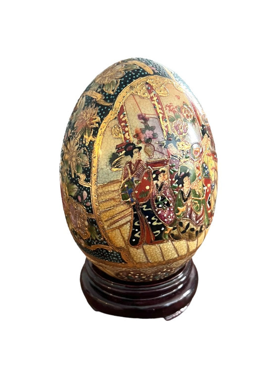 Hand Painted Satsuma Egg Gold Guild Moriage Geisha Girls Crackle Finish W/ Stand 7"