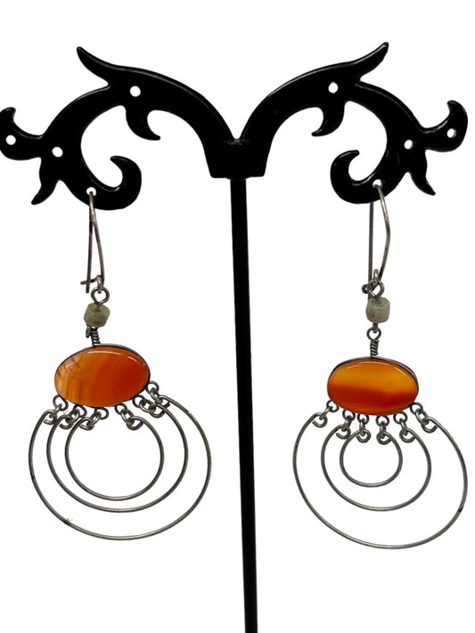 Silvertone Concentric Circle Earrings with Orange Stone Lightweight Wire Hook Pierced